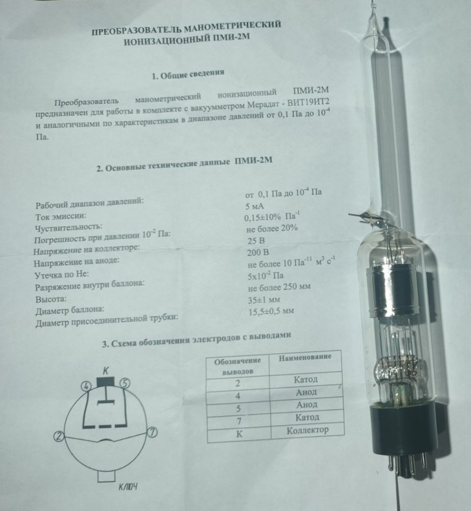 Преобразователь манометрический ионизационный предназначен для преобразования давления газа в электрический сигнал, предназначен для работы в комплекте с вакуумметрами или другими аналогичными устройствами.