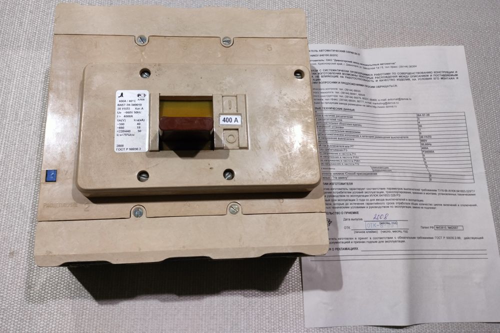 Силовой 3 полюсный автоматический выключатель переменного тока в литом корпусе на номинальный ток 400 А.