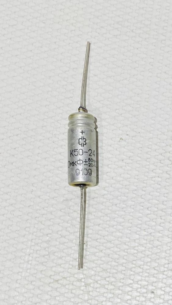 К50-24 220мкФ(mkF) 25В(V) +80/-20% Конденсатор электролитический, алюминиевый, герметичный. Структура условного обозначения: К50-24 – серия и конструктивное исполнение корпуса конденсатора; 220мкФ – номинальная ёмкость; 25В – номинальное напряжение; +80/-20% – допустимое отклонение ёмкости. Конденсаторы К50-24 предназначены для работы в цепях постоянного и пульсирующего токов. Применяются в схемах развязки на низких частотах, фильтров источников питания, шунтирующих цепях, в стационарной и переносной аудио и видеоаппаратуре, в космической и авиационной технике и т.п.