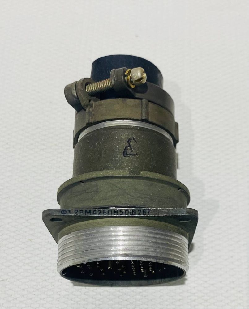 2РМ42БПН50Ш2В1 вилка блочная (приборная) с прямым патрубком, гайкой для неэкранированного кабеля и контактами покрытыми серебром Соединитель 2РМ42БПН50Ш2В1 цилиндрический низкочастотный негерметичный объемного монтажа с резьбовой фиксацией сочлененного положения. Предназначен для работы в электрических цепях постоянного и переменного токов частотой до 3 МГц при напряжении до 700 В. Соединители 2РМ изготавливаются восьми конструктивных исполнений по 15 типономиналов каждого исполнения, 830 типоконструкций. Используются для работы в узлах и блоках радиоэлектронной аппаратуры специального и общего назначения. Соединители состоят из двух частей: вилки и розетки. Вилки и розетки могут быть как блочными (приборными), так и кабельными. Блочная часть соединителей изготавливается без патрубков или с прямыми патрубками, кабельная часть без патрубков, с прямыми или угловыми патрубками. Сочленение соединителей - резьбовое, поляризация корпусов одношпоночная. Покрытие контактов - золото или серебро. Метод монтажа - пайка. Предназначены для монтажа с экранированными или неэкранированными кабелями (проводами) при этом меняется вид концевой гайки патрубка.